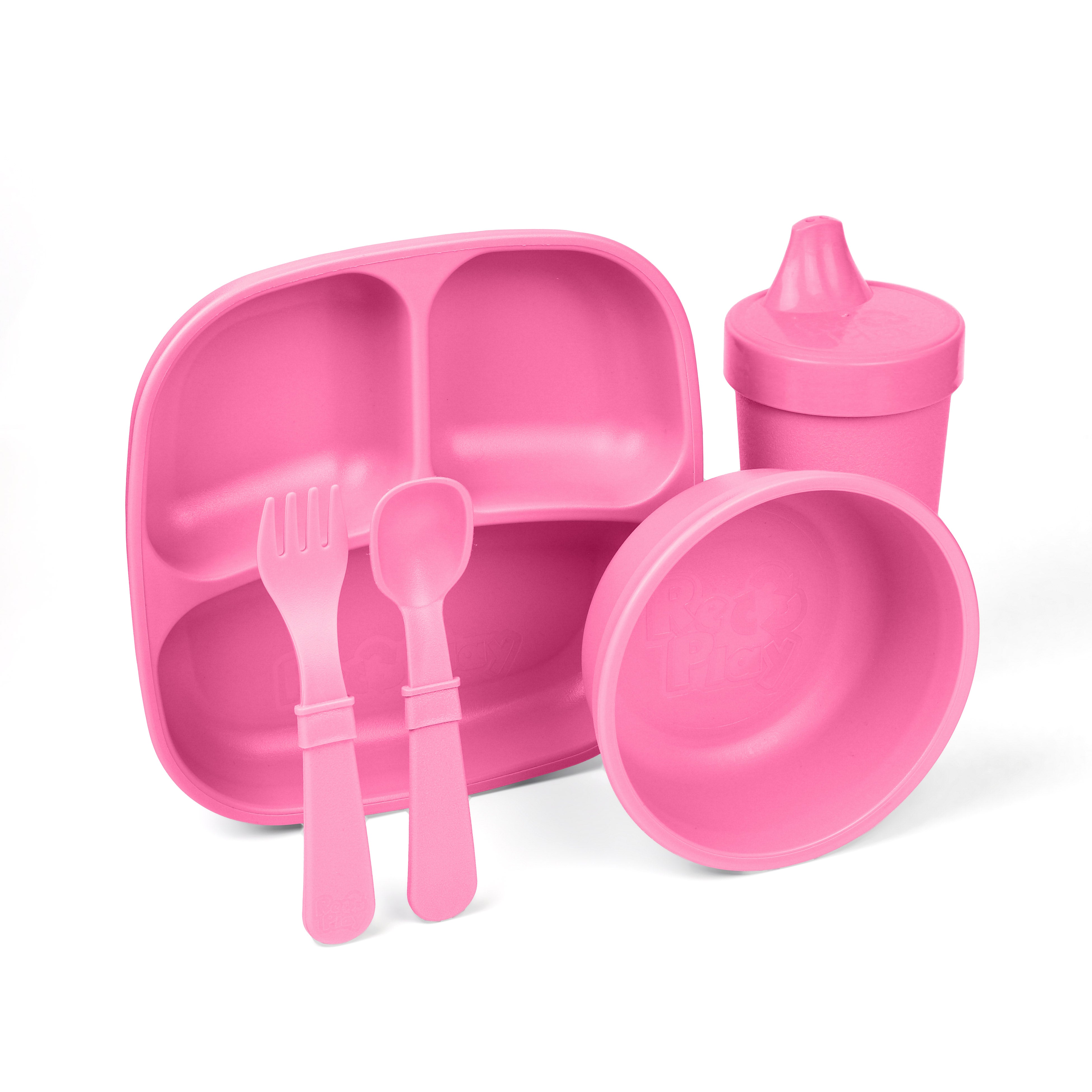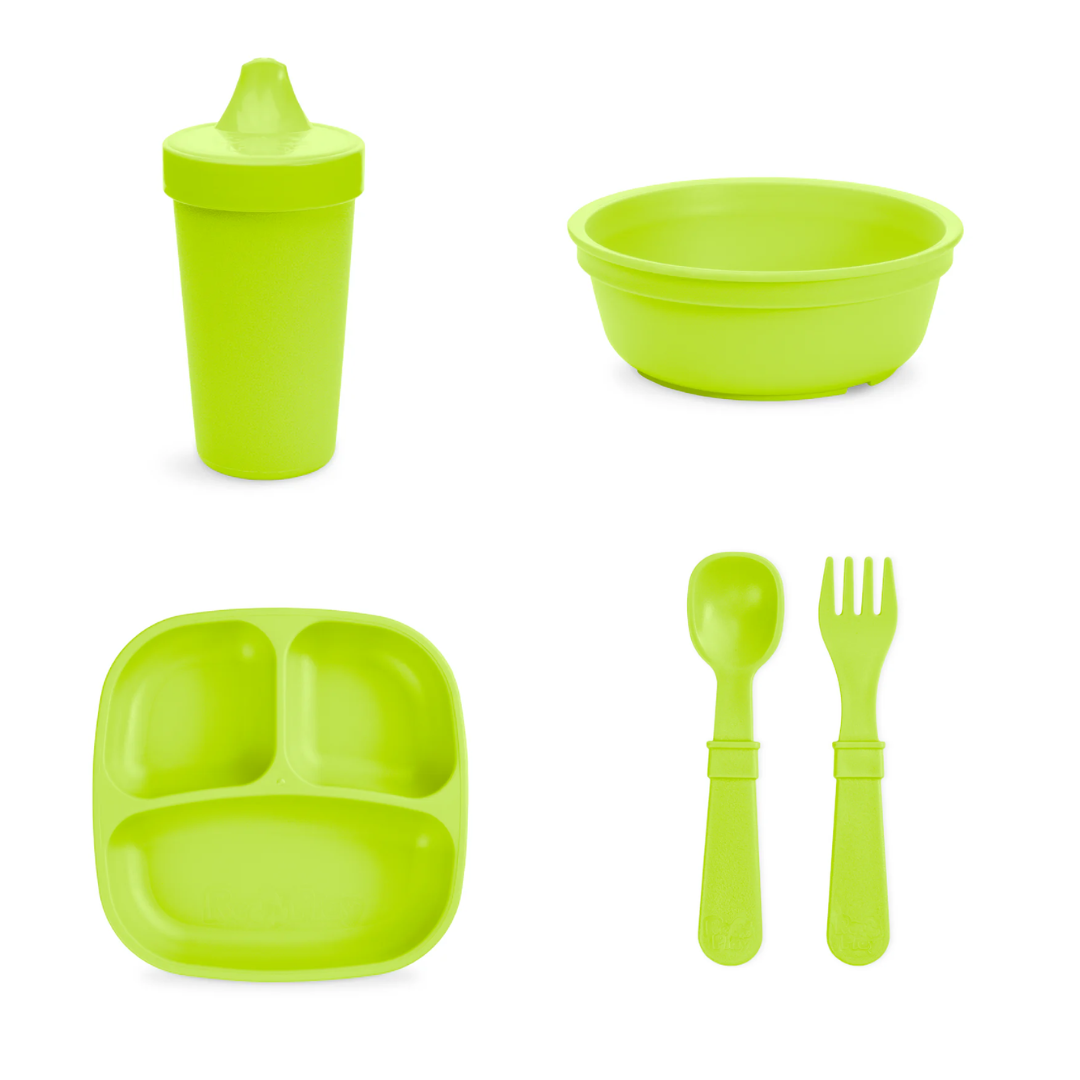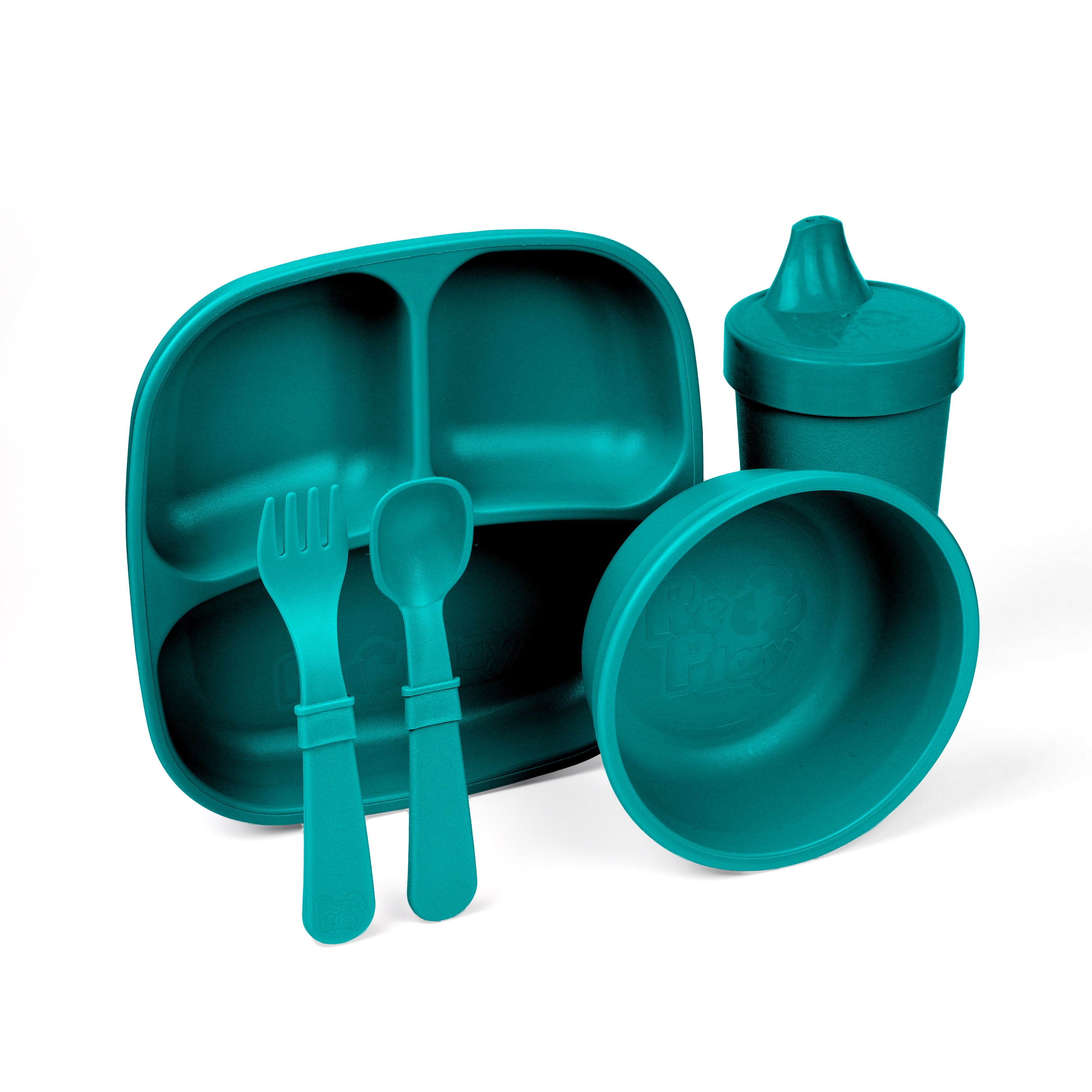Imagine a plate that keeps your carrots from canoodling with your chicken nuggets, a cup that laughs in the face of spills, and utensils that fit tiny hands like a glove. Plus, it's all made from recycled materials, so you're saving the planet while you munch!