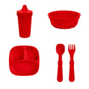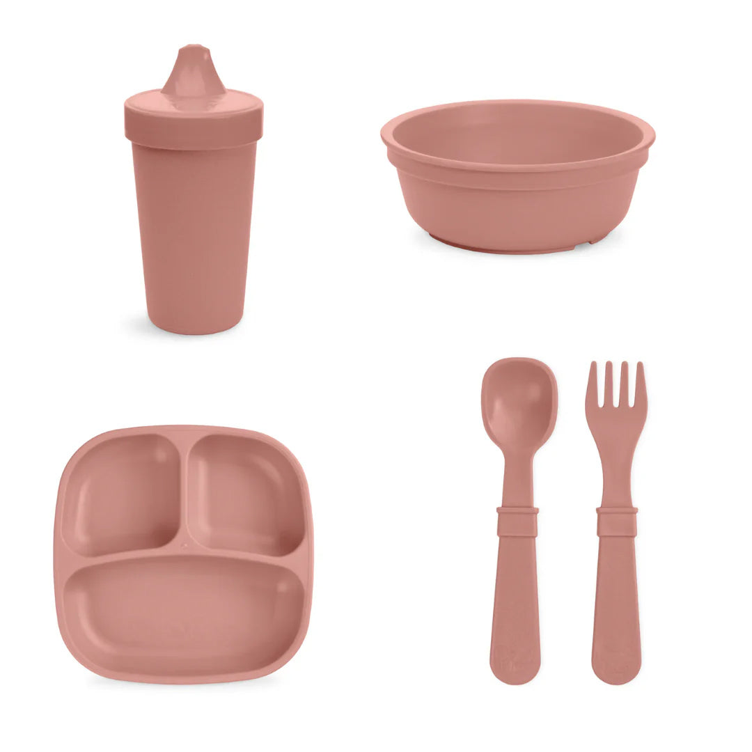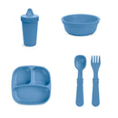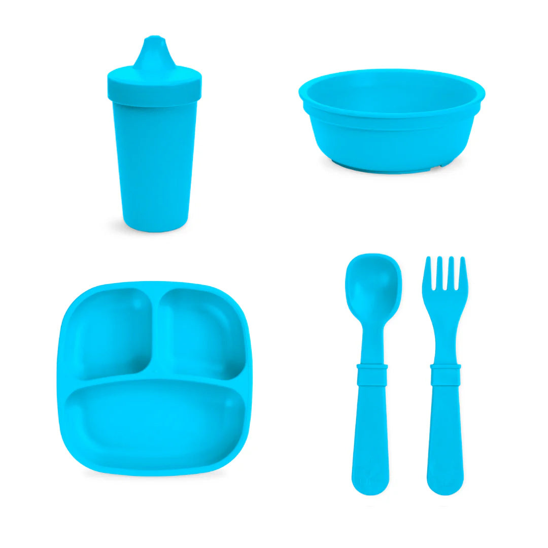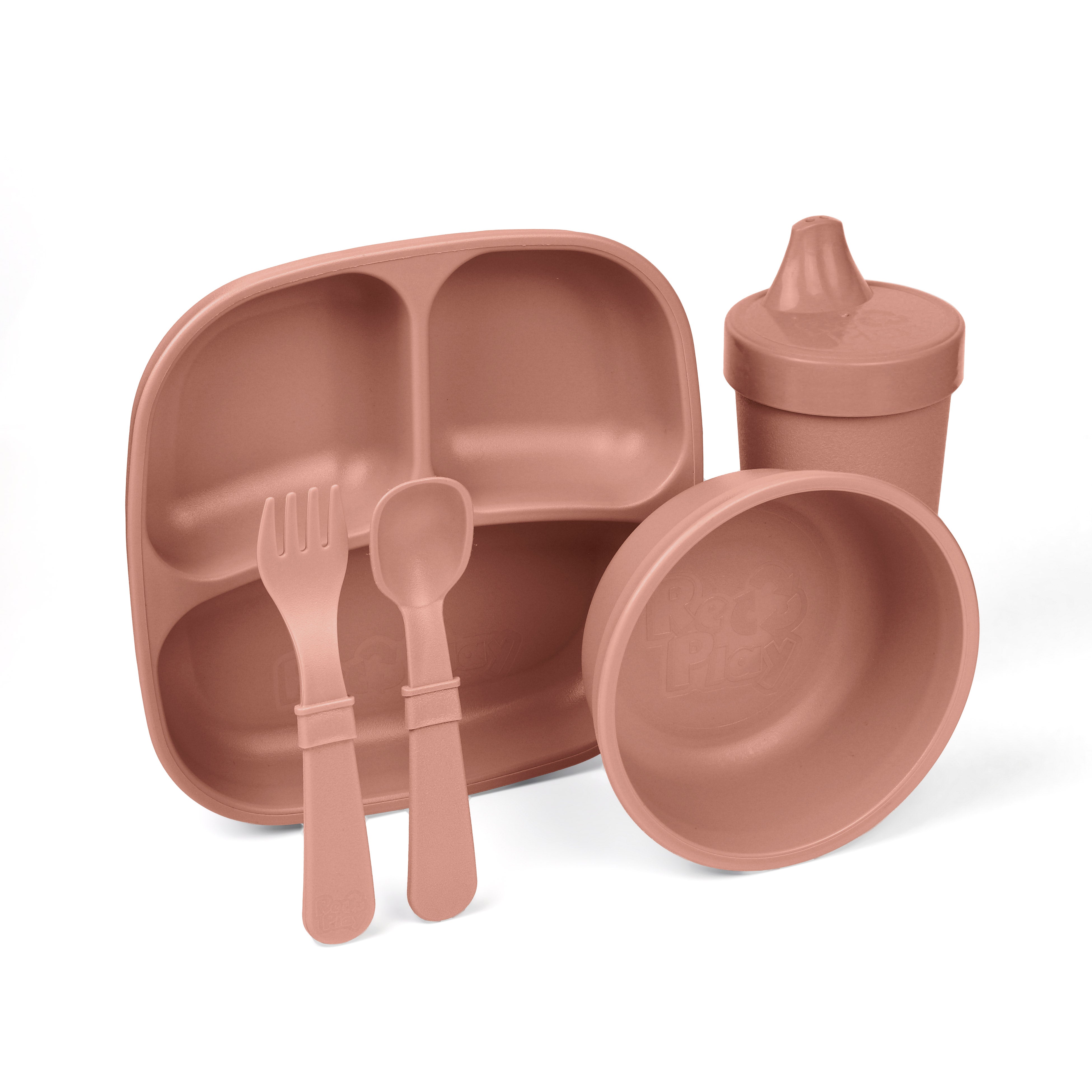 Imagine a plate that keeps your carrots from canoodling with your chicken nuggets, a cup that laughs in the face of spills, and utensils that fit tiny hands like a glove. Plus, it's all made from recycled materials, so you're saving the planet while you munch!